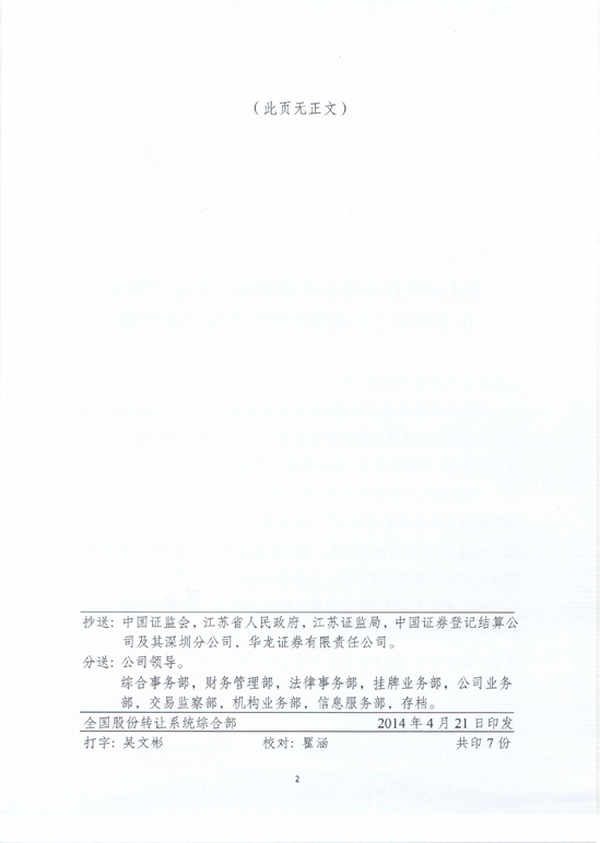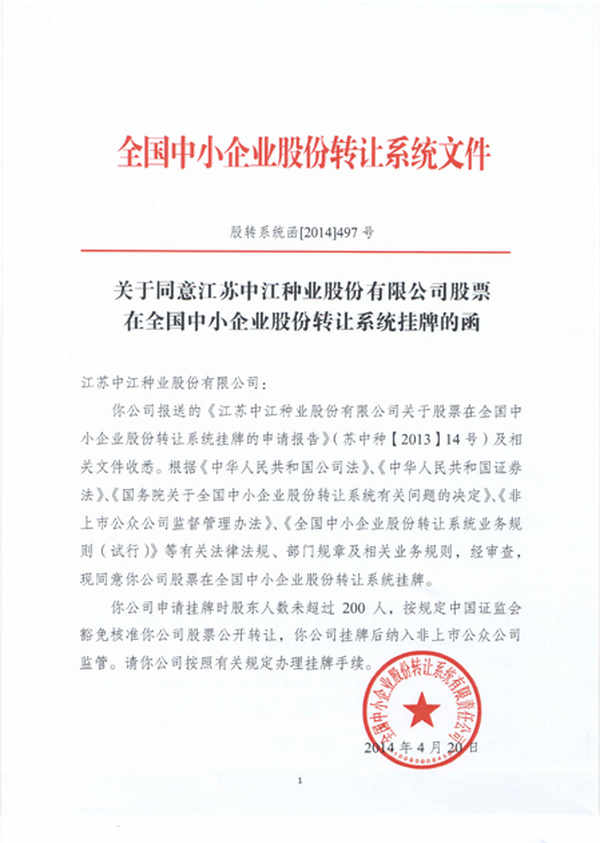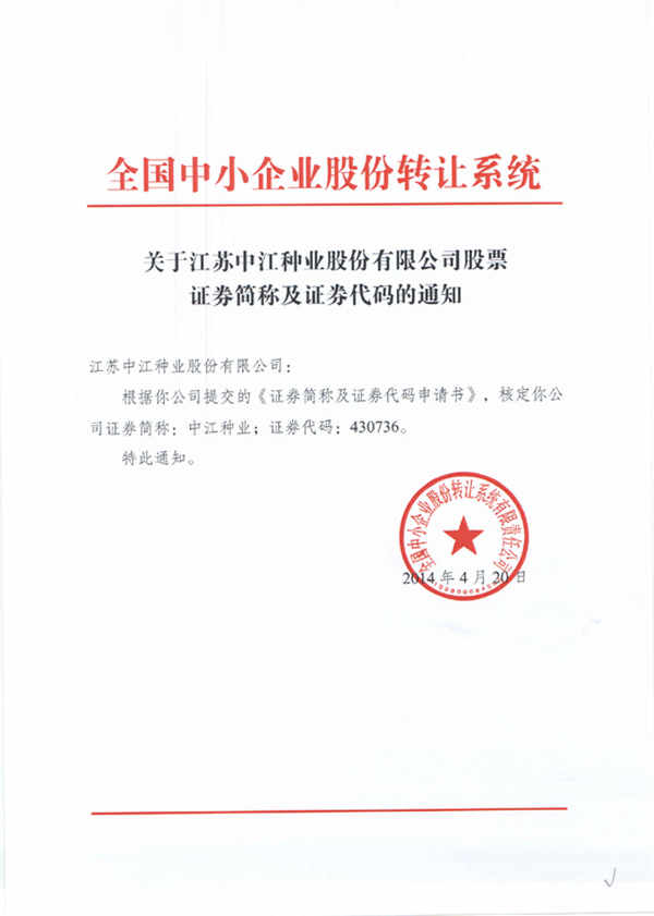 在三大中介的指導下,公司歷時9個月的不懈努力,經全國中小企業(yè)股份轉讓系統(tǒng)有限責任公司同意,江蘇中江種業(yè)股份有限公司股票在全國中小企業(yè)股份轉讓系統(tǒng)掛牌,成為江蘇首家在新三板獲準掛牌的種業(yè)企業(yè)。證券簡稱:中江種業(yè);證券代碼:430736。