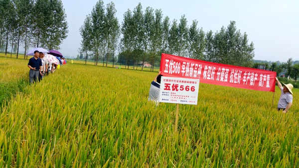7月12-18日,公司推廣的雜交早稻新品種“五優(yōu)566”現(xiàn)場觀摩會議在江西宜豐縣、東鄉(xiāng)縣、臨川區(qū)、余都縣等地陸續(xù)展開,來自各縣鄉(xiāng)鎮(zhèn)零售商、種植大戶近200人在不同地點(diǎn)參加了現(xiàn)場觀摩,該品種是公司在南方市場推廣的第一個(gè)早雜秈稻新品種,2014年12月通過江西省審定,五優(yōu)566在江西表現(xiàn)株型好、分蘗力強(qiáng)、抗性好、出米率高、豐產(chǎn)性好等優(yōu)點(diǎn),通過不同地點(diǎn)現(xiàn)場觀摩,五優(yōu)566長勢表現(xiàn)得到經(jīng)銷商、種植大戶積極肯定和一致好評,在各地座談會上宜豐縣漆經(jīng)理和東鄉(xiāng)縣胡經(jīng)理表示來年大力推廣新品種五優(yōu)566,為農(nóng)戶提供良種,為農(nóng)戶增收增效;宜豐縣農(nóng)業(yè)局梅局長也表示好品種就該在宜豐縣大力推廣。中江種業(yè)江西分公司雄總、水稻部黃經(jīng)理都表示明年在江西為各縣農(nóng)戶提供優(yōu)質(zhì)優(yōu)良的五優(yōu)566水稻新品種。(附五優(yōu)566審定資料)