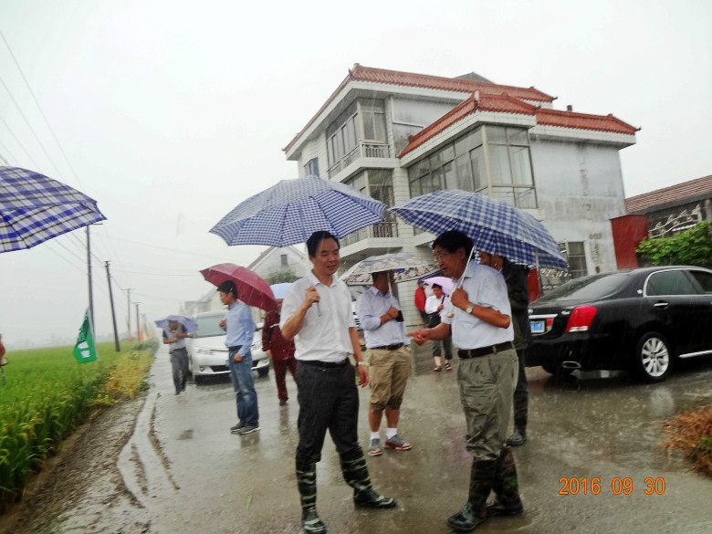 接著萬院士一行冒著淅淅瀝瀝的秋雨,實(shí)地考察了如東縣馬塘鎮(zhèn)亞蘇村的寧粳8號(hào)百畝核心示范方。示范方面積106畝,采用機(jī)插精確定量栽培技術(shù),5月28日播種,6月13日移栽,9月22日測(cè)產(chǎn):畝有效穗數(shù)26.3萬,每穗總粒數(shù)126.2粒,結(jié)實(shí)率92%,千粒重按26.5克計(jì)算,理論產(chǎn)量達(dá)809.19公斤/畝。萬院士一行不顧雨水打濕衣服,深入田間地頭,仔細(xì)查看了寧粳8號(hào)長(zhǎng)勢(shì)長(zhǎng)相、穗粒結(jié)構(gòu),對(duì)該示范方的技術(shù)措施和品種表現(xiàn)給予了充分肯定。