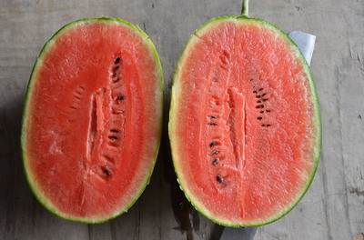 該品種由杭州市良種引進(jìn)公司于2011年從我公司引進(jìn)。 該組合2012年參加浙江省設(shè)施小型西瓜省外引種生產(chǎn)試驗(yàn),平均畝產(chǎn)1407.6公斤,比對(duì)照‘拿比特’增產(chǎn)8.7%。春播從開花到果實(shí)成熟33.0天,第一雌花節(jié)位8.3節(jié),雌花節(jié)位間隔5.9節(jié)。果實(shí)橢圓型,頭茬瓜果形指數(shù)1.2,果皮淺綠色,覆墨綠色狹齒帶,表面光滑,無(wú)棱溝,平均單瓜重2.6公斤。果皮厚0.6厘米左右,瓤色紅色,汁液多,口感好,瓤質(zhì)脆。現(xiàn)場(chǎng)考察實(shí)測(cè)中心折光糖度13.2度,邊緣折光糖度9.2度;耐儲(chǔ)運(yùn)性較好。經(jīng)浙江省農(nóng)科院植微所2012年苗期枯萎病抗性鑒定,平均發(fā)病率為55.0%,病情指數(shù)為47.5,為中抗枯萎病。經(jīng)2012年省品審會(huì)辦公室組織的品質(zhì)品嘗,綜合評(píng)分為90.0分,比對(duì)照高3分,位居第1位。