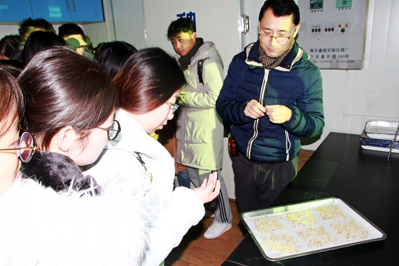 12月28日,冷風(fēng)刺骨,卻擋不住莘莘學(xué)子求知的步伐。在揚(yáng)州大學(xué)農(nóng)學(xué)院種子科學(xué)系主任許如根教授的帶領(lǐng)下,師生一行70余人來我公司開展社會實(shí)踐活動。師生們先后參觀了公司種子質(zhì)檢中心、種子倉儲加工中心,并就所學(xué)的書本知識與現(xiàn)場技術(shù)人員進(jìn)行了學(xué)習(xí)交流。